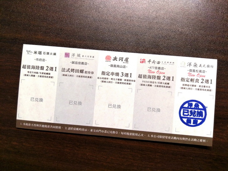 這張是上次在千荷田蔬食百匯ATT店結帳時店家送我的,其實這次在洋朵義式廚坊微風松高店吃飯,結帳時我又拿到一張,總之你來吃就會拿到啦。拿到之後下次用餐時記得拿給店家就可以得到免費美食喔。