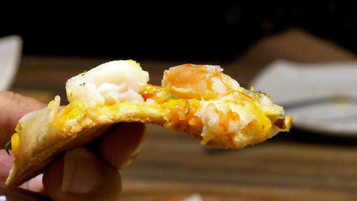 這個義式總匯海鮮Pizza除了滿滿海鮮之外,還有大量蕃茄與洋蔥,倒是起司比我想像來得少。這樣也好,起司吃多了容易肥啊。