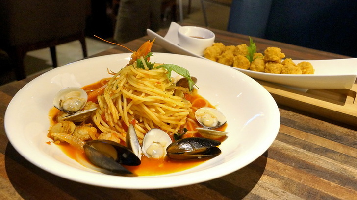 最後,老媽點了亞馬遜海鮮義大利麵的單點,我點了義式總匯海鮮Pizza與98元套餐(麵包,義式蘑菇濃湯,冰咖啡與盆栽鮮奶酪),店家招待一份酥炸黃金雞米花。
