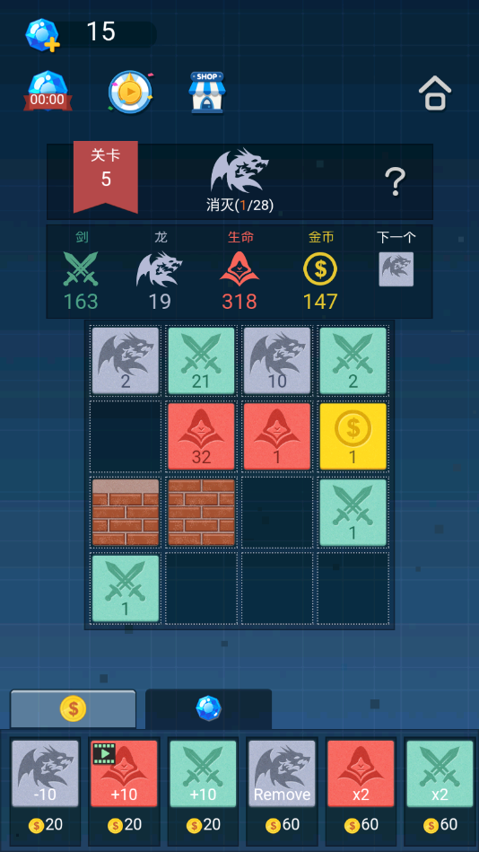遊戲裏主要的方塊分為:血條方塊、金幣方塊、惡龍方塊、劍方塊。合併血條方塊會增加玩家的血量;合併金幣方塊可以獲得金幣,遊戲裏的金幣可以發動遊戲下方的能力,每種能力只能購買一次;合併惡龍方塊會積累惡龍數量,才可以進行消滅,同時也會導致玩家扣血;合併劍方塊,則可以斬殺惡龍。隨著遊戲闖關的深入,後面還有出現障礙方塊(當然這種方塊是可以擊破的),以及各種武器方塊,目前我解鎖了一種斧頭方塊。