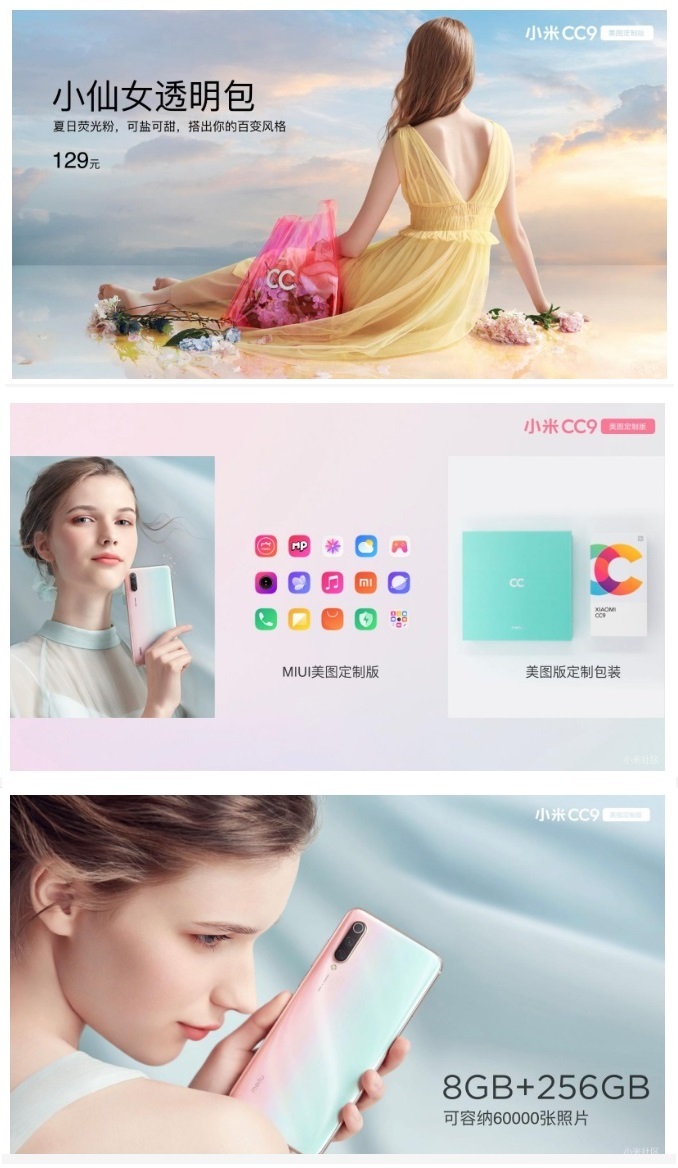小米 CC9美圖定製版,採用8GB+256GB存儲組合,足夠容納60000張照片。同時搭載MIUI美圖定製版系統,以及定制美圖版外包裝。