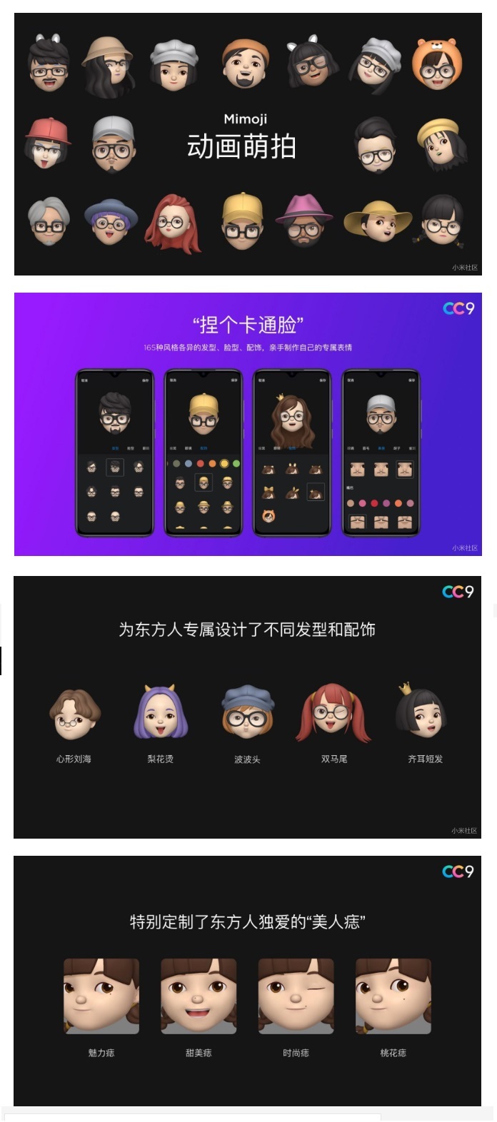 小米CC9 還支持Mimoji動畫萌拍技術,通過AI識別人臉特徵,生成不同專屬動畫表情。165種風格各異的髮型、臉型、配飾,讓你可以親手製作自己的專屬表情。