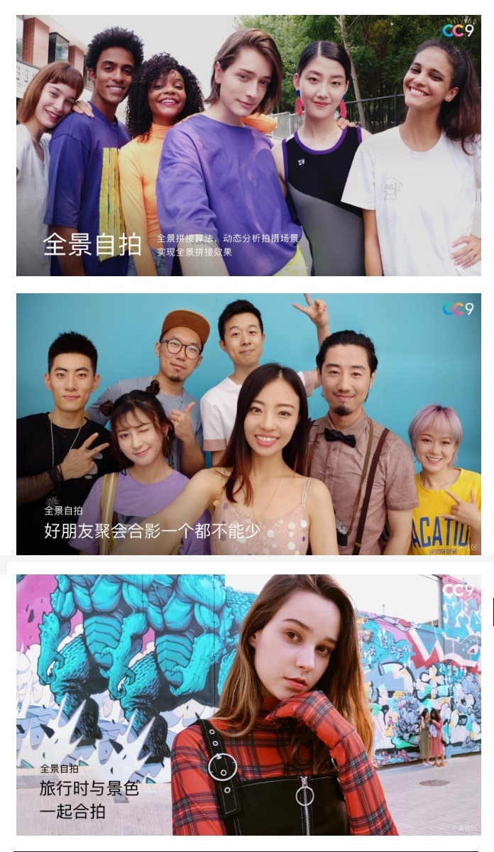 3200萬旗艦自拍+超質感美顏,不僅好看,更是好玩。小米CC9搭載全景拼接算法,支持全景自拍模式,不僅容得下更多朋友,也容得下更多風景。