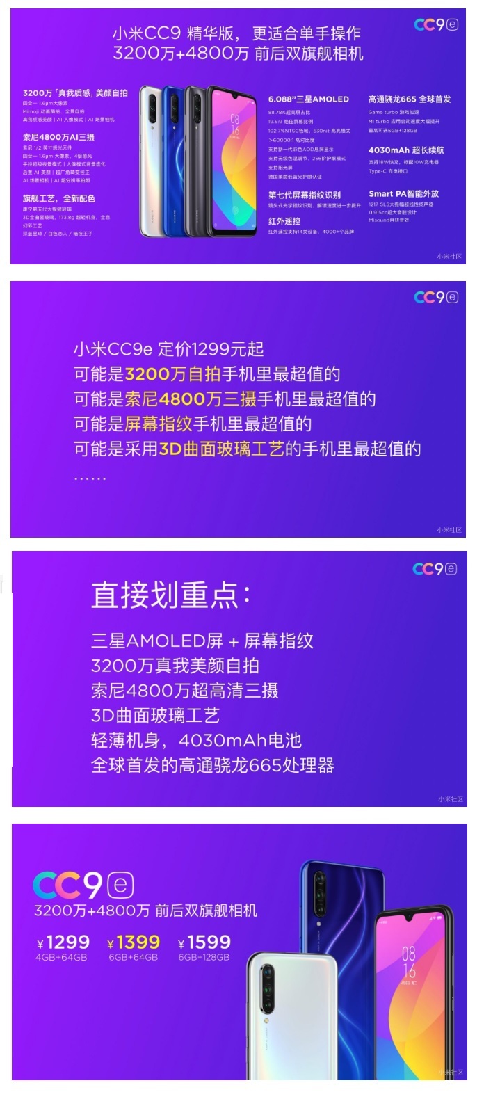擁有和小米CC9一樣的旗艦相機和絕大部分核心體驗的小米CC9e,絕對是1500元檔的最超值選擇。直接放上一張重點圖,小米CC9e,僅售1299元起!