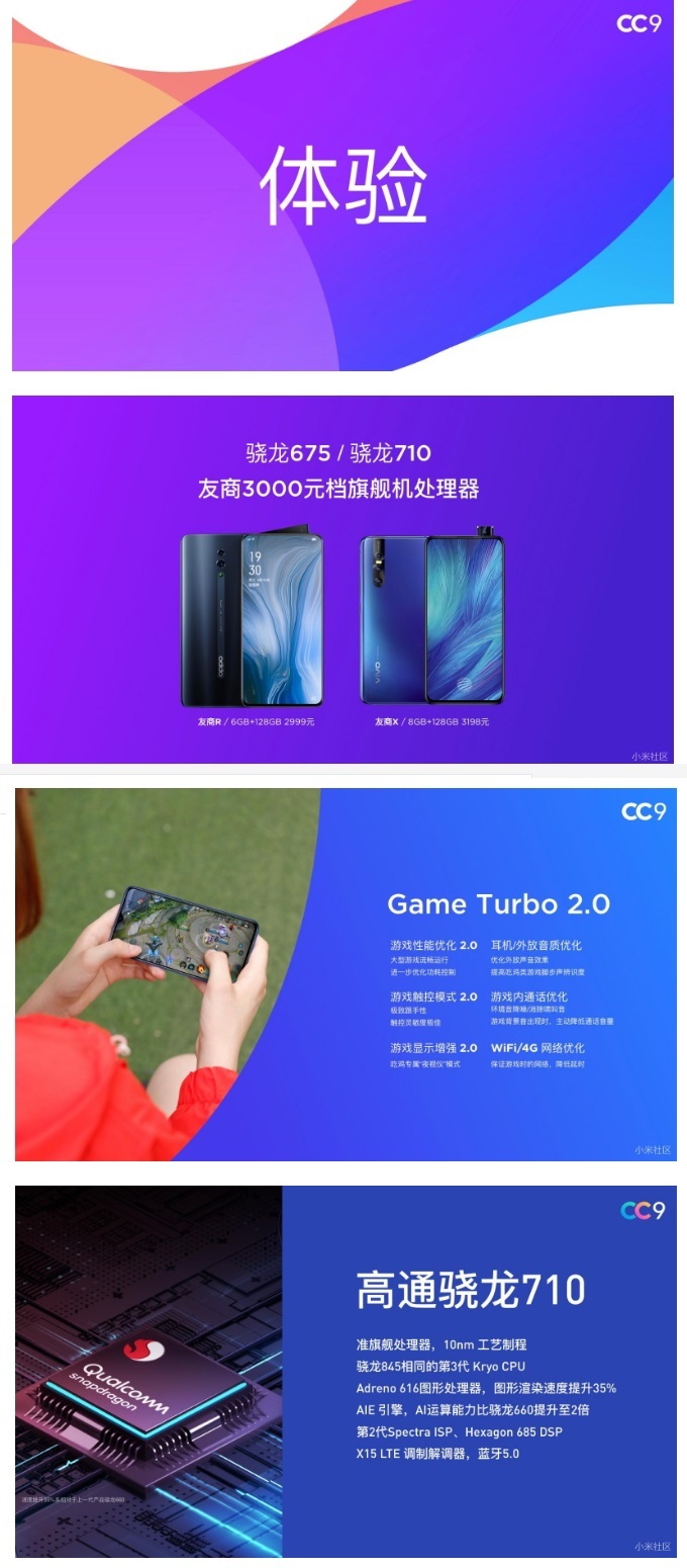 在體驗方面,小米CC9搭載了和大部分友商3000元檔旗艦機相同的處理器——驍龍710,這是一顆10nm製程工藝芯片,性能和功耗表現都極為出色。同時搭載飽受米粉好評的Game Turbo 2.0功能。