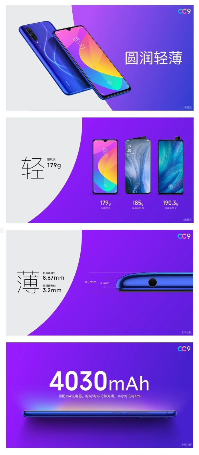 在外觀方面,小米CC9最大的特點就是圓潤輕薄。小米CC9僅重179g,機身厚度僅為8.67mm。在如此輕薄的基礎上,小米CC9的電池容量高達4030mAh!對比友商的旗艦產品,小米CC9更勝一籌。