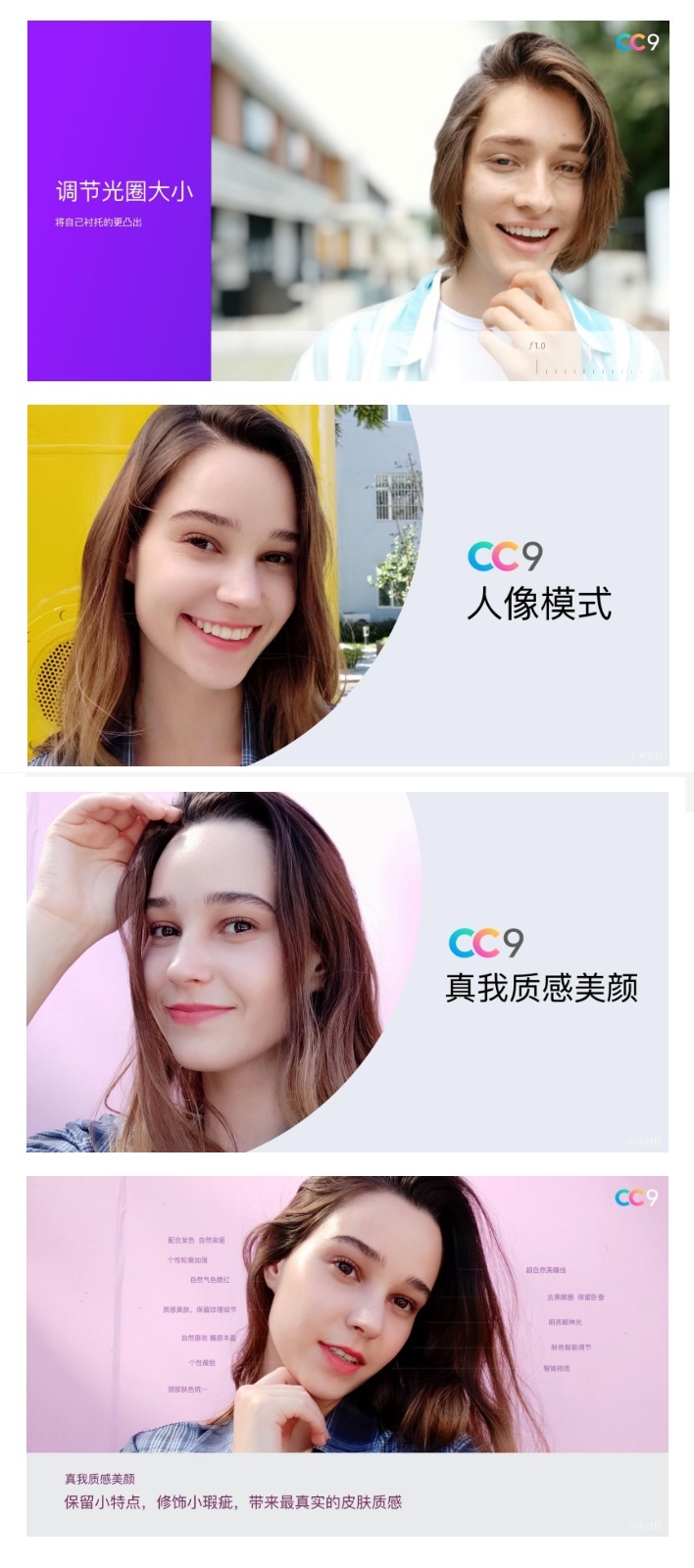 小米CC9美圖定製版的經典人像功能,採用MT圖像增強技術和MT獨家色彩系統,對比友商自拍美化效果,小米CC9美圖定製版零磨皮,就能打造出水潤感。