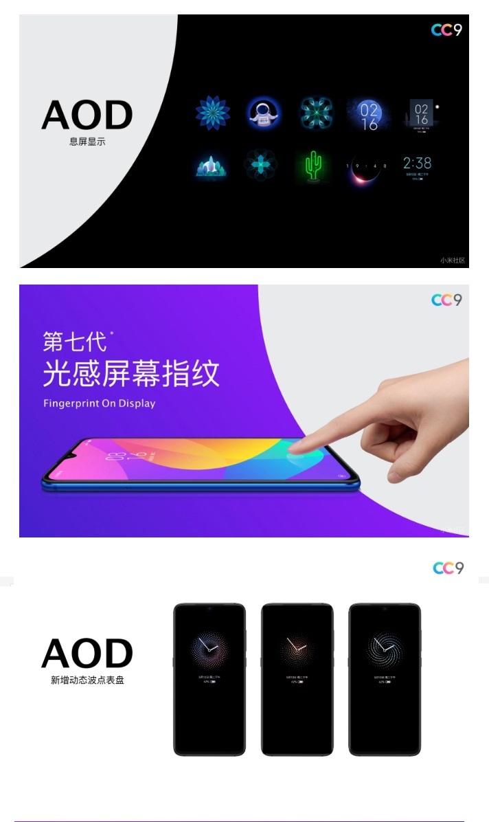 小米CC9搭載第七代光感屏幕指紋,支持AOD熄屏顯示。同時為小米CC9新增動態波點錶盤,你喜歡麼?