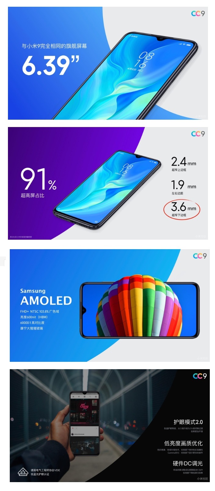 小米 CC9採用與小米9完全相同的旗艦屏幕,6.39 ” 三星 AMOLED屏幕,在擁有91%超高屏佔比的同時,還支持高亮模式以及陽光屏2.0功能。米粉們非常歡迎的護眼模式2.0 、硬件級DC調光,小米CC9通通搭載。