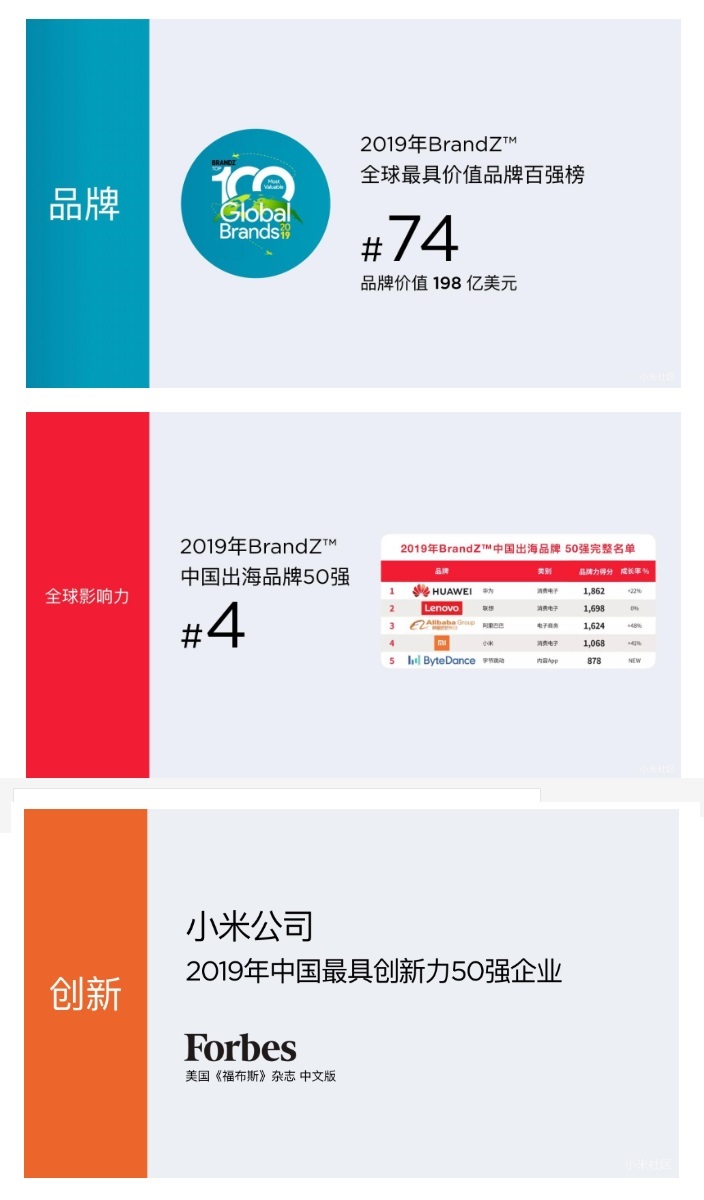 發布會正式開始。首先上台的是小米集團創始人 ——雷軍。雷總向大家分享了幾個好消息:小米公司進入《福布斯》雜誌評選的2019年中國最具創新力50強企業。在2019年BrandZ™公佈的全球最具價值品牌百強榜中,小米名列74位,品牌價值198億美元,同時也是中國出海品牌50強中的第4位。