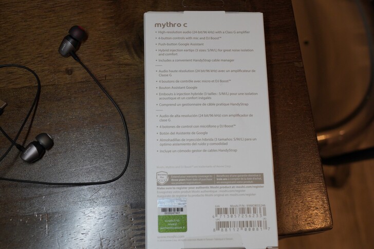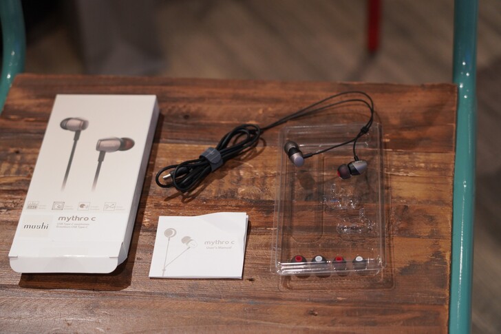 ▲Moshi mythro C(入耳式)耳機本體、說明書、耳塞右紅左白。