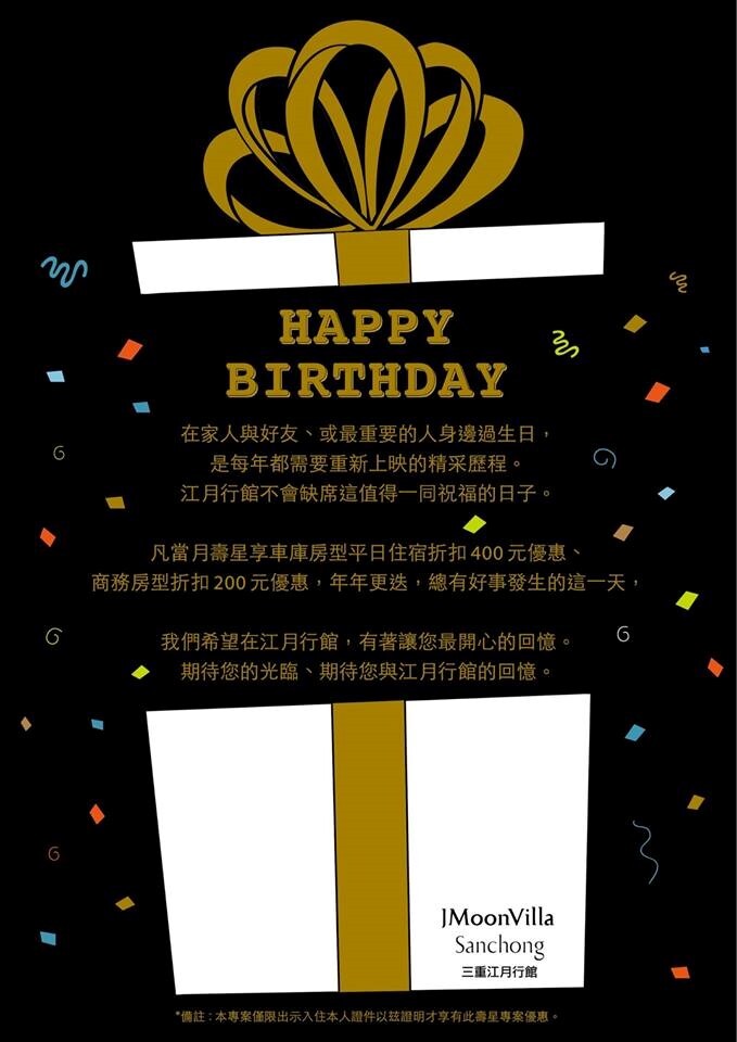 凡當月壽星享車庫房型平日住宿折扣400元優惠、商務房型折扣200元優惠,當月壽星,車庫房型折價200元 !