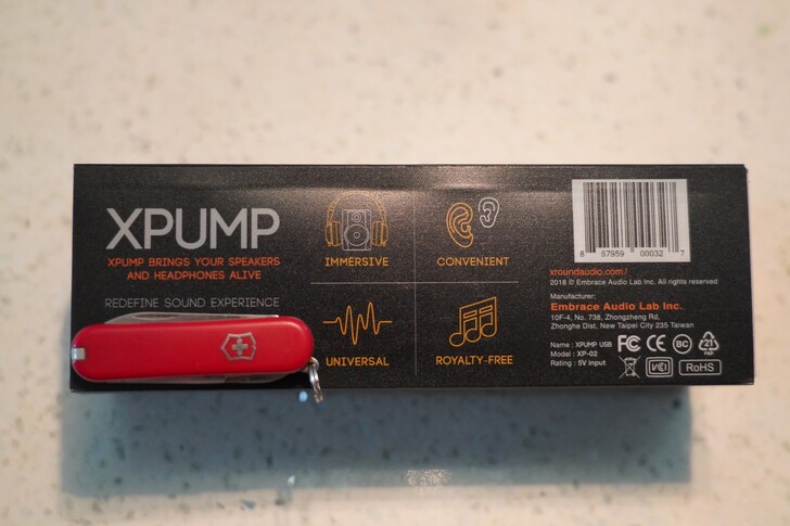 ▲外盒背面,上面簡單的描述XPUMP Premium的相關特色,特色有深浸式的聽感: XPUMP加強了聲音的寬度和深度,透過專利的演算法及時重建聲音細節、相容性高: 輸入/輸出介面能連接市面上大多數裝置、使用方便: 無須安裝複雜的設備與線材、音源不受限: 不必透過杜比、DTS專有格式或特殊設備與軟體,才有環繞效果,透過XPUMP premium就能讓遊戲、Youtube、KKBOX等音訊來源,立刻產生環繞效果,加深影音體驗感。