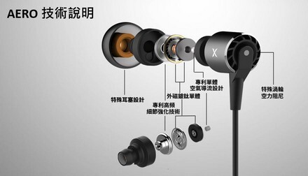 ▲耳機外觀上最特別的大概就是在耳機後方的雙渦輪造型,,它的正式名稱是【特殊渦輪空氣阻尼】是針對音色層次感而做設計的。