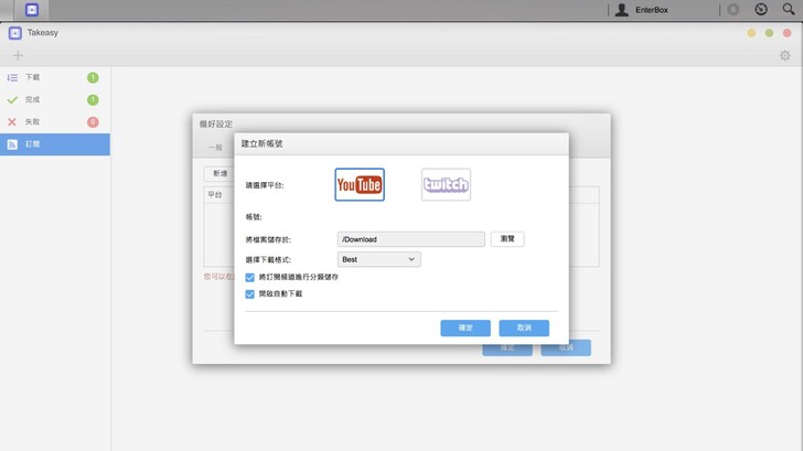 由於影片數量多,要是我,可不想每次還要手動去設定任務呢!所以可以利用訂閱功能,定期下載新影片,真棒!目前支援 Youtube 和 Twitch 兩個平台。