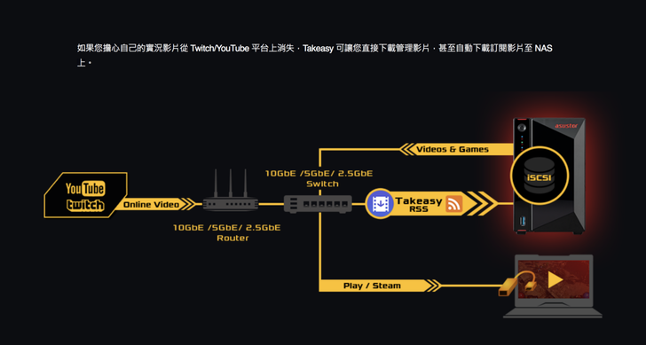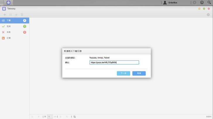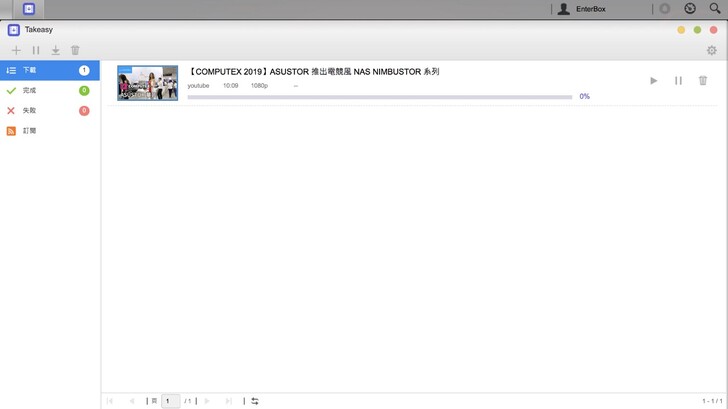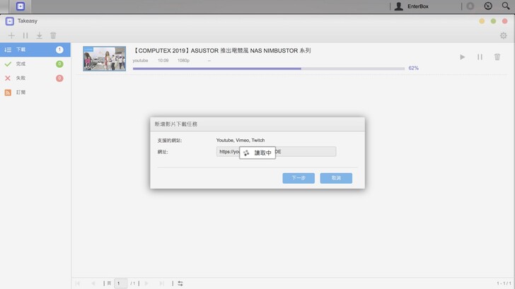 等待安裝的過程,我們來說一下,Takeasy 對於創作者來說真的是很好的工具。因為有時可能上傳一些影片,碼率和規格超過 Youtube 的限制,就會被二次壓縮轉檔。而透過 Takeasy 你就可以直接保存已經被 Youtube 轉檔過的影片,不管未來是要搬站到其他平台、開新的頻道經營,平常有做好 RSS Takeasy 就會變得很方便。Takeasy 是我覺得 ASUSTOR 從備份出發,衍生出來對創作者非常有實用價值的軟體、功能。