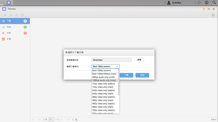 選擇儲存位置與下載格式。可以看到下載的選項非常多,但其實就是分為 webm 和 mp4 兩種,或是單獨的聲音檔 m4a,其餘就是畫質、碼率的差異。完成選擇後,按「下載」。