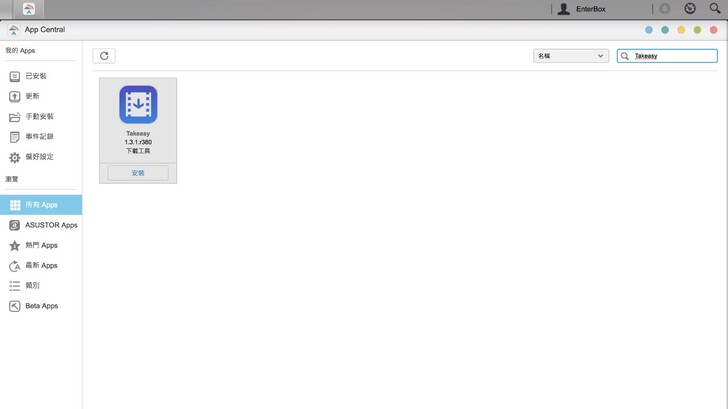 這次使用 ASUSTOR AS5202T,發現他有主打一個功能叫做 Takeasy,基本上就是 Take easy 兩個字合在一起。而他具體可以做到的功能,對於有定期、大量上傳影片到 Youtube 的創作者來說是很方便的功能。首先,到 App Central 搜尋「Takeasy」,點選「安裝」。