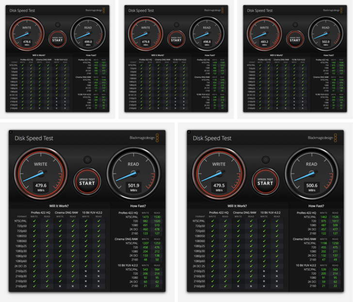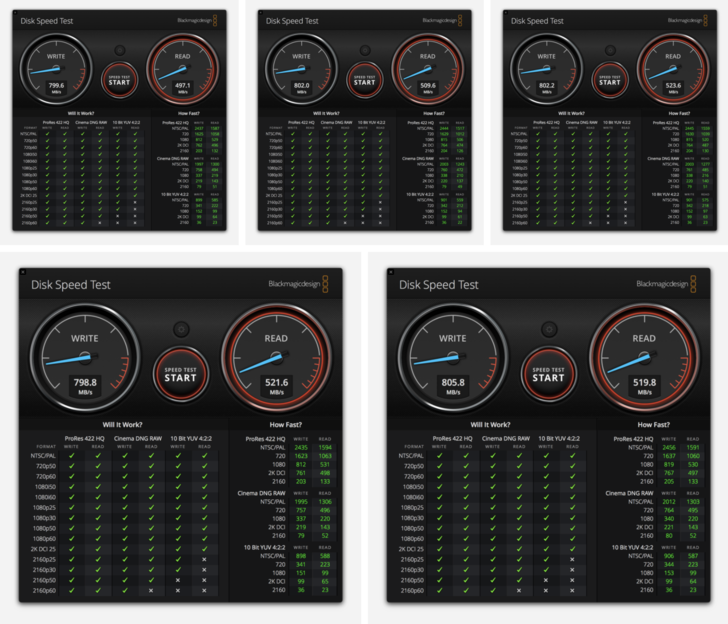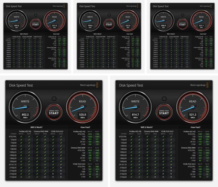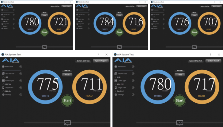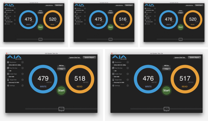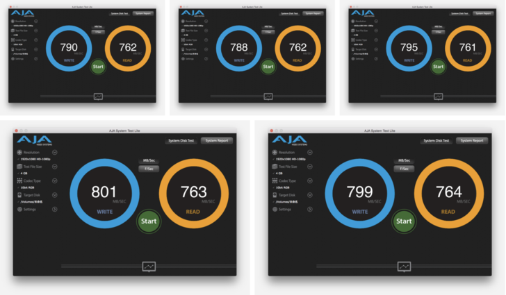 在 Apple MacBook Pro 13(i5–7360U / 8GB / 256GB)以 AJA System Test,透過 USB3.1 Gen2 Type C to Type C 連接 AKiTiO U31C(AFPS)進行測速。