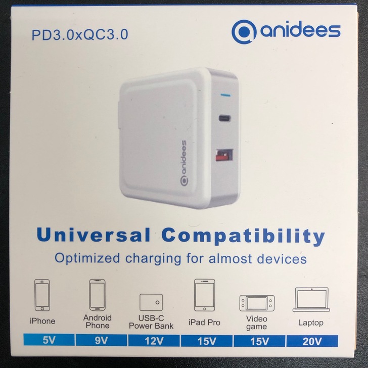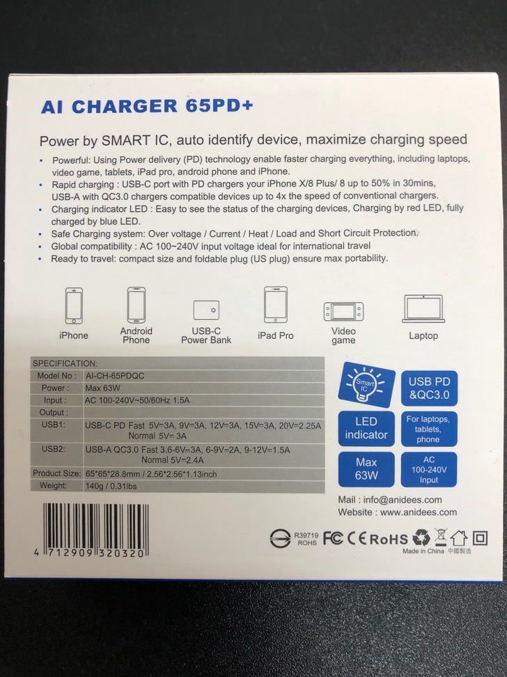 總結:Anidees 63W是一款可智慧辨識給予最快充電速度的高功率快充,可以在手機或是筆電快沒電的時候提供源源不絕的強大電力以最快的速度將裝置電源補給完成,且帶有摺疊式插頭,可支援國際電壓,全球通用。