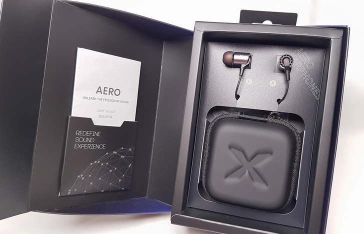 ▼ 內容物 由左至右:耳機收納盒、AERO耳機本體、AERO雙層耳塞及人聲強化耳塞、說明書。