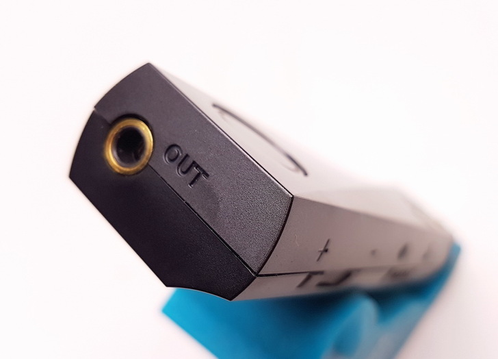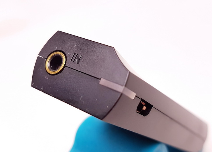 ▼ XPUMP Premium右側和上部:3.5mm 音訊輸入的連接線插孔和顯示燈,同時可看到上部的micro USB連接孔 做為 DAC 使用時的訊源連接。