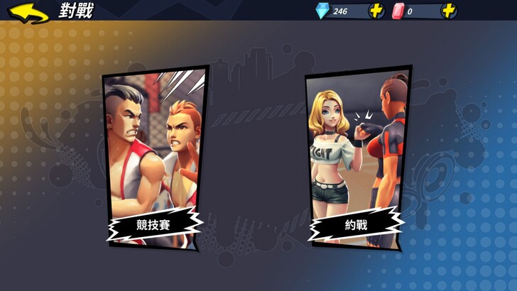 對戰顧名思義就是跟對手打啦,對戰的對手可以有NPC或是真人玩家,進去後會讓你選擇要進行競技賽或是約戰,約戰就是跟朋友開房間(不要想歪ㄟ)對戰,競技賽則是由電腦來配對,進去後可以選擇你要控制的角色,按下開始匹配後就可以快速來進行一場比賽。