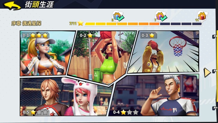 一開始新手教學後會有街頭生涯、對戰、天梯賽幾個系統可以選擇,街頭生涯是類似一般遊戲的主線,故事發展情節會一步一步帶領主角熟悉及進入狀況,這邊也是最好拿獎勵的地方,所以如果沒有達到3星都建議再回去打到3星喔!!