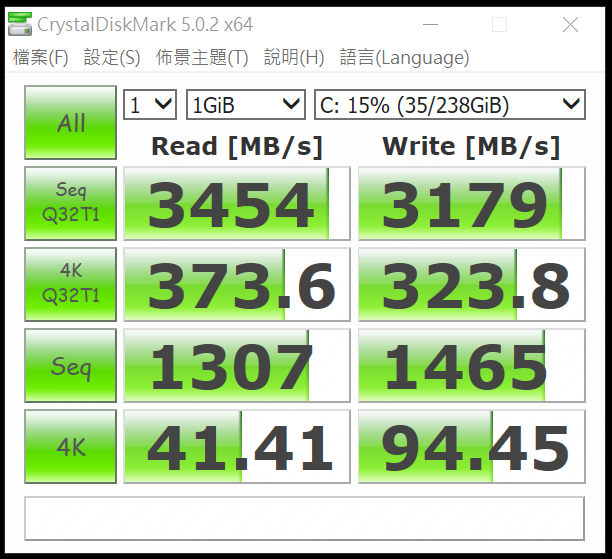 Crystal Disk Mark多佇列(QD32)循序讀取3454MB/s、寫入3179MB/s,表現優異~開機速度變超快