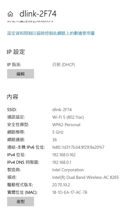 筆電測試結果 WiFi 5 Intel AC8265 實測速度