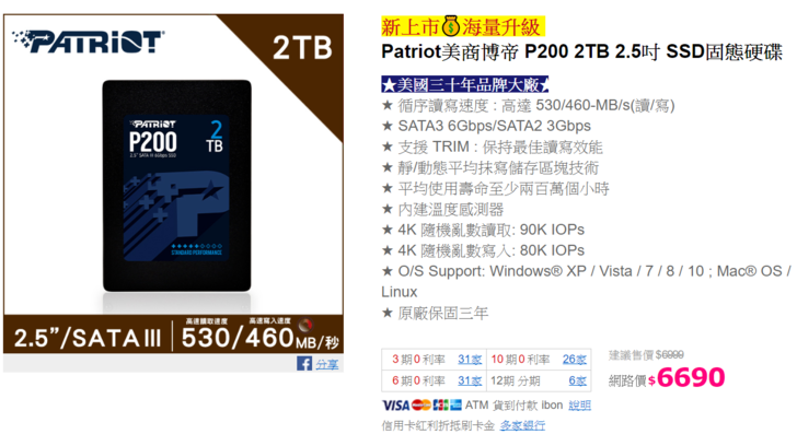 博帝在記憶體、SSD、隨身碟比較常見的就是上架在網購平台上,因此有買便宜的方式就是搭配信用卡與儲值卡的方式來購買,以這個牌價 $6690 的 Patriot P200 2TB 折扣下來基本上可以低於六千元,以 2.5” SSD 應該算是市場上最便宜的選擇了。