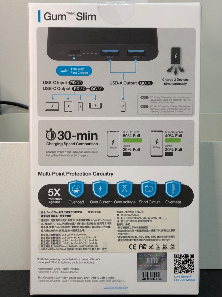 總結:這是一款支援雙快充系統PD/QC的高效能快充行動電源,支援同時充電三種裝置,且可邊充邊用。最方便的是還可幫Macbook充電,在外只需要攜帶一顆Gum Slim即可搞定所有行動裝置的供電需求,現在官網正在特價,可以參考選購。