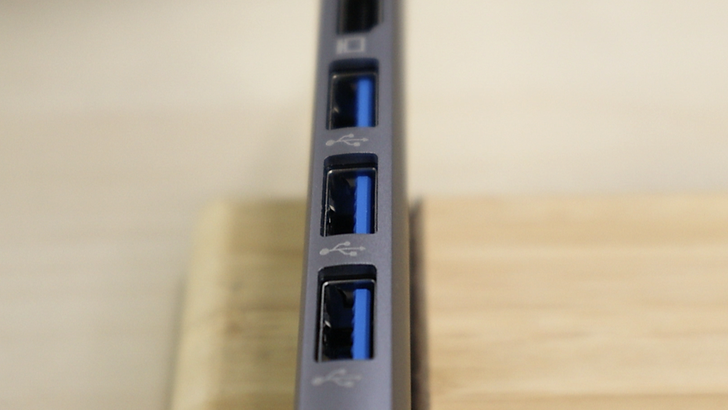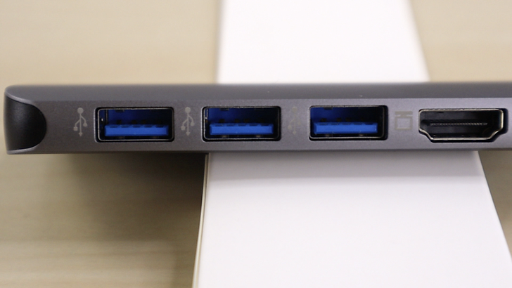 三個USB Type A連接滑鼠,隨身碟,iPhone都相當夠用。但因為USB3.0理論頻寬是5Gbps,如果有兩個高速的SSD傳輸資料,就會互相搶頻寬。