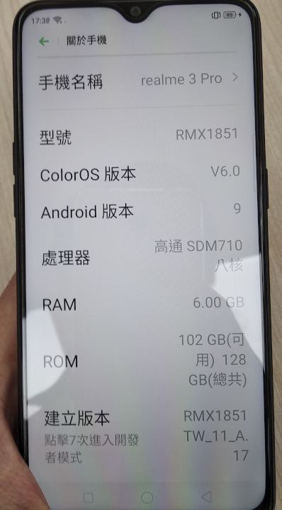 ▲ 螢幕是6.3吋水滴螢幕喔。 驗明正身是realme 3 pro,型號RMX1851,搭載ColorOS v6.0,OS採用Android 9,更有6GB RAM以及128GB ROM。