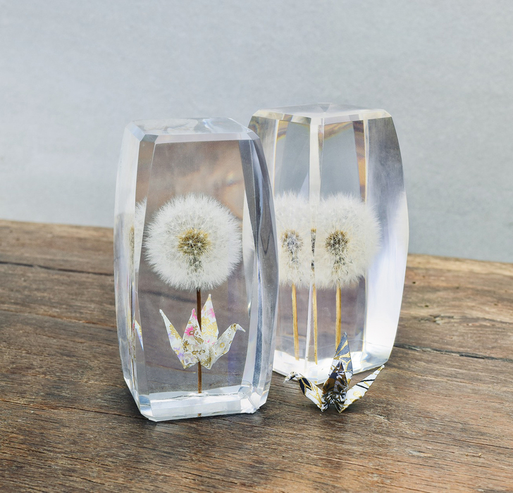 被人們視為的平庸草本植物蒲公英,需要陽光與雨水讓自己茁壯,種子隨著風到處飄散與扎根,擁有陽光般的美麗花朵與希望般的白色絨球,象徵希望素材之一。紙鶴不具華麗的技法,需要的是分秒細心與專注,隨著紙鶴數量不同有祝福、祈福、祈願..特殊意義的含意,最具和平素材代表之一。