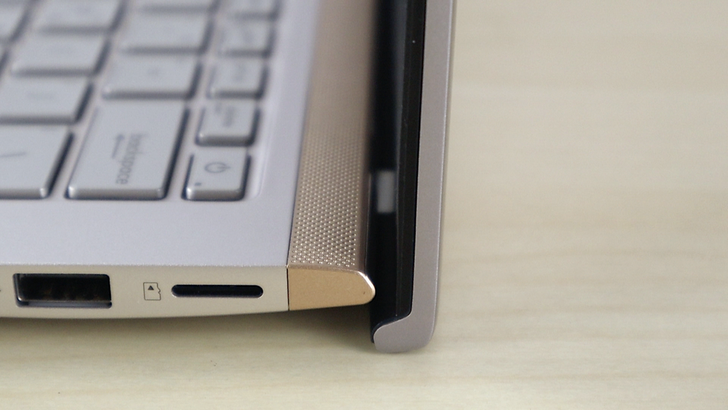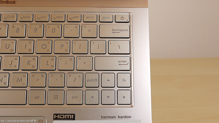 C 件也是金屬材質,霧霧的表面處理像灑滿金粉,手感也不錯。鍵盤雖然是塑膠材質,但是與機身基本上沒什麼色差,所以一體性非常好,對鍵盤與機身有強烈要求顏色一致的人,UX333 是很好的選擇。而且 UX333 的鍵盤也有三段背光,背光的顏色是白色。