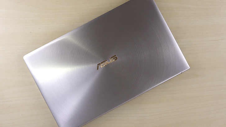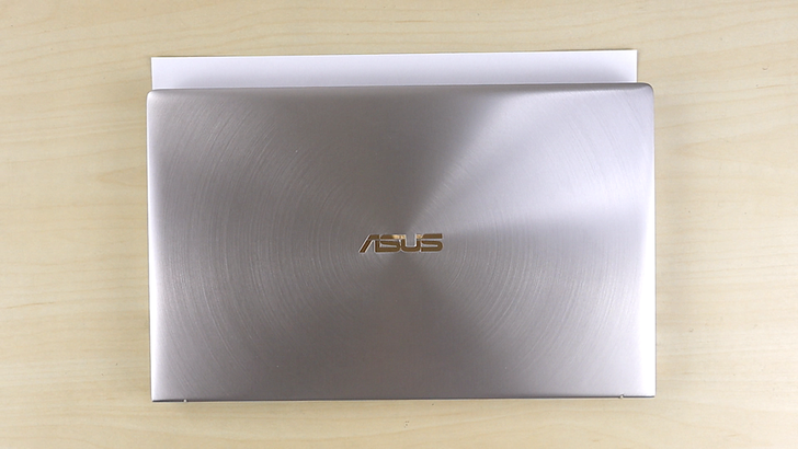 機身樣貌,A 件是同心圓髮絲紋,中間是金色的 ASUS Logo。