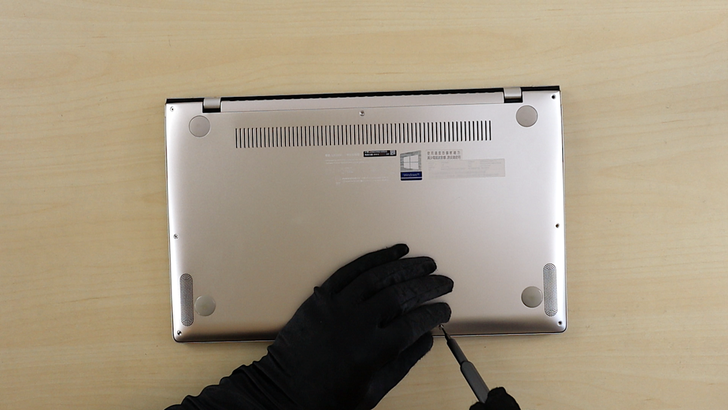 底部看來有 8 顆六星型 T5 螺絲,但其實靠螢幕樞紐的兩個腳墊下還各有一顆十字螺絲,所以要先將腳墊移除。