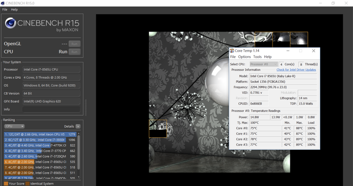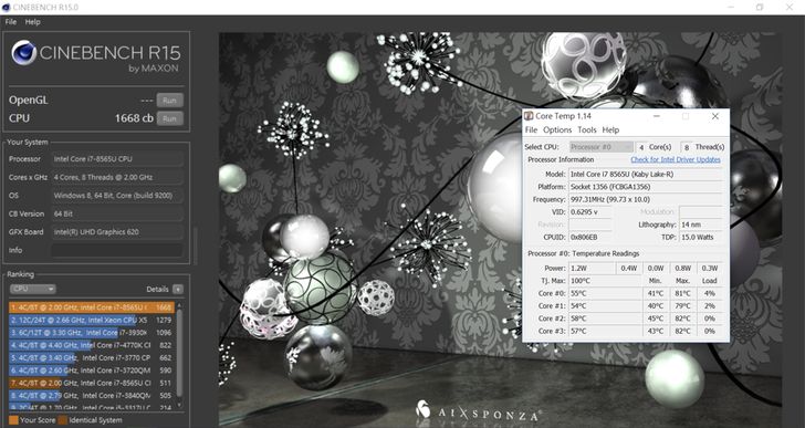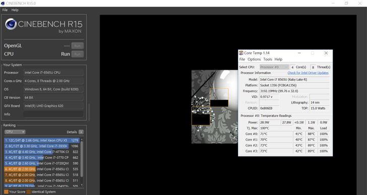 i7–8565U 是一顆 4C8T 的處理器,即便 UX333 的風扇也是相當大,連散熱導管也比一般的寬,長時間高負荷使用還是壓不太住這顆 CPU。Cinebench R15 跑分穩穩在 500 分以上,同時從 Core Temp 觀察到,初期基本時脈在 3.1GHz~3.3GHz,功耗在 28.9~30W 之間,CPU 溫度到 80~90 度左右。