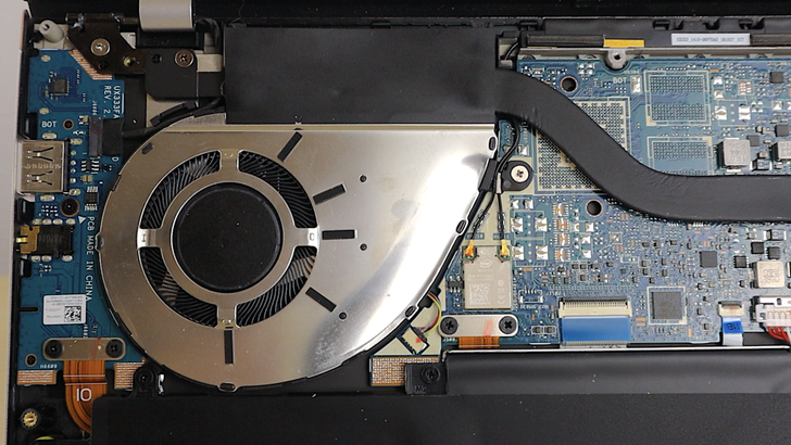 螺絲下卸下後,可以看到下面一半都是電池的區域,上面主機板分成兩塊,中間放了一個非常大的風扇。左邊板子上是一些速度比較慢的 I/O,從主機板上可以看到,風扇與 CPU 間隔了距離,中間留有獨立顯示晶片和其記憶體的位置。沒錯,UX333 在國外是有販售搭載 MX150 顯卡版本的 UX333FN,此外國外甚至還有紅色的款式可以選擇,相當羨慕呢!