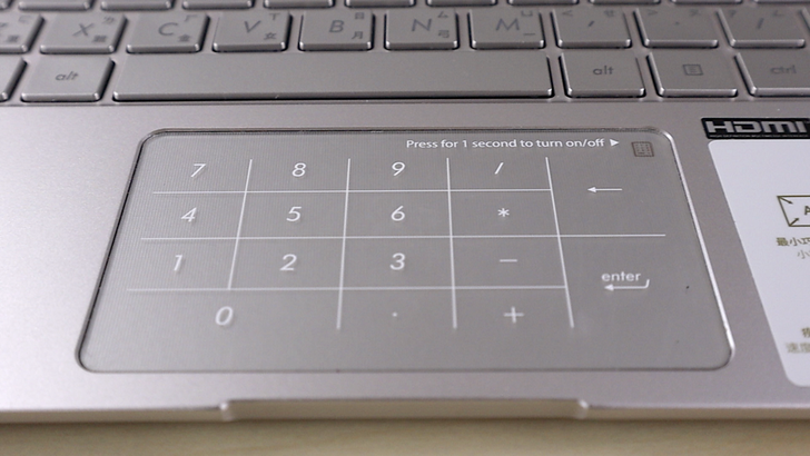 即便我個人覺得這個設計比較雞肋,但我覺得在製作工藝上,華碩還是很用心。使用薄膜讓大家知道,這個觸控板有這個功能,要多來使用。而很妙的是,當你開啟數字鍵模式時,觸控板底下會有亮光標示出數字和界線,所以其實這個薄膜,當你熟悉以後撕掉也沒關係的。