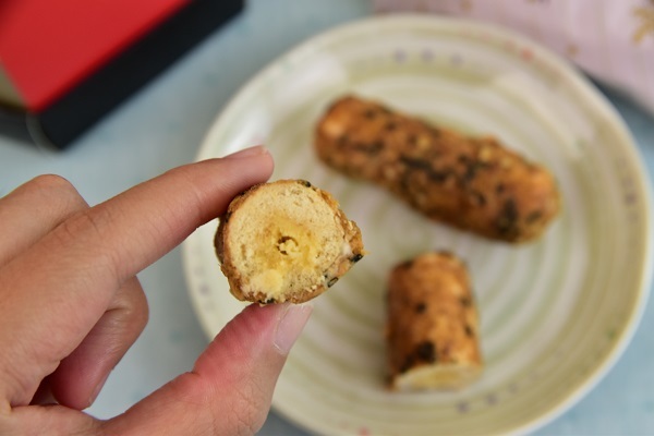 肉鬆捲外表酥酥脆脆的,刀子切下去發出喀ㄘ喀ㄘ的聲音,光用聽的就覺得很好吃,讓我迫不及待咬了一口,表皮上的芝麻香馬上,這是用糙米膨發的,裏頭再注入蛋黃口味的內餡,