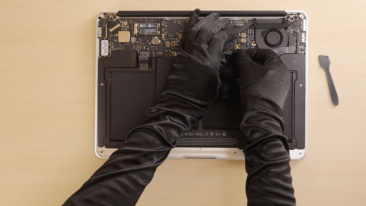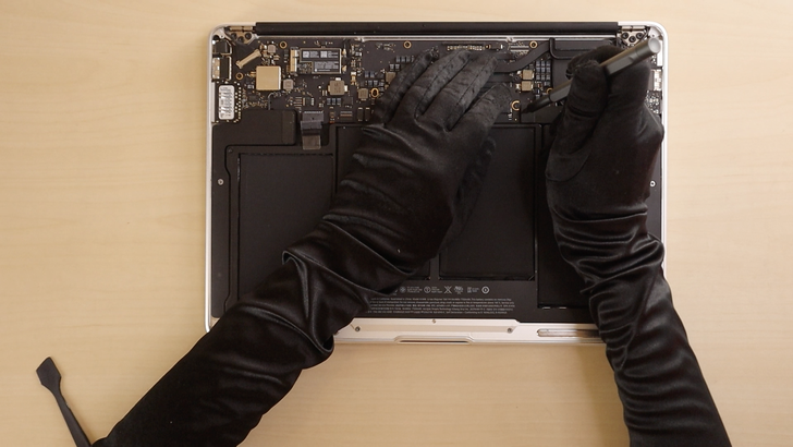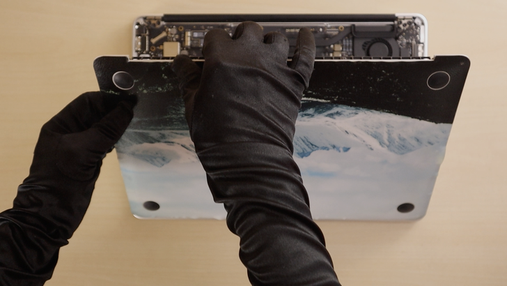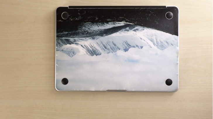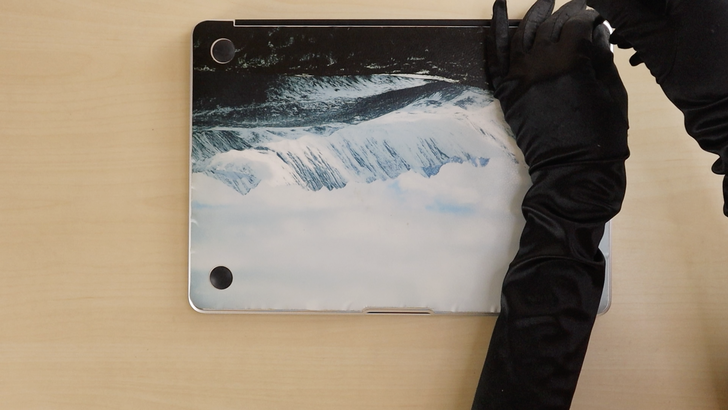 這台MacBook Air的使用者,對MacBook Air愛護有加,底面整個風景畫貼膜,不知道是地球哪裡,有去過的人幫忙解答一下。總之,由於貼膜把螺絲都遮住了,要先逐一將螺絲位置翻出來,等下比較好拆。