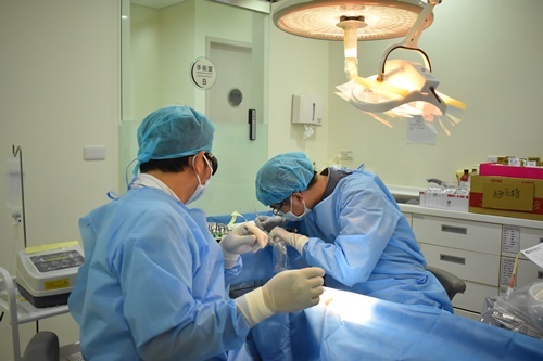 林醫師全副武裝-戴著口罩+手術帽+手術衣扶著剛完成手術的我站起來