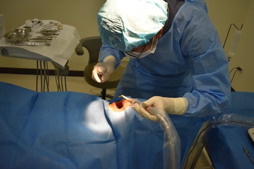 進到手術房後躺在診檯上護士先用碘酒為我做口腔消毒