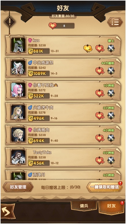 好友部分盡量加滿30位強而有力,能抱大腿的好友,在推圖方面每個禮拜都能租借好友的3個角色卡,所以盡量找大課長級的加~呵呵