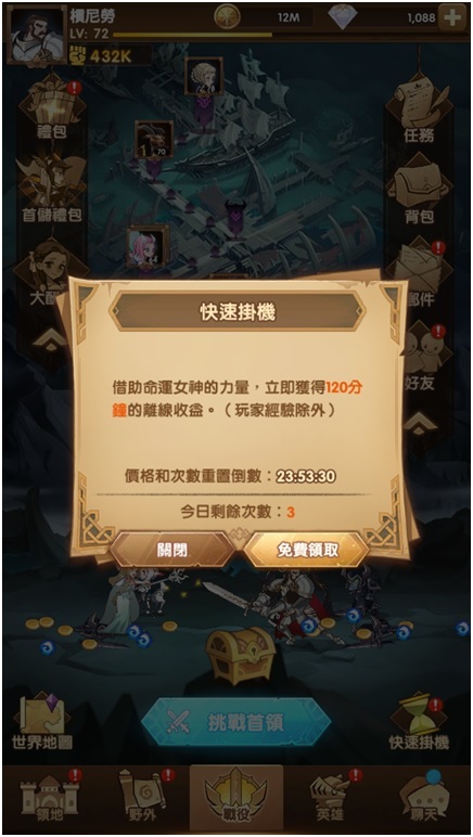 另外快速掛機每日也有一次免費的經驗值、裝備、道具等等可以拿,大家記得要去拿取喔。