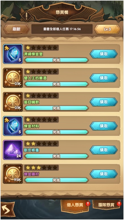 野外的懸賞欄是資源很好拿取的要素之一,每天都能參加,分為個人懸賞和團隊懸賞,團隊懸賞比較吃好友和自己雙方有無史詩+的角色,所以有好的好友能抱大腿賺取高額的資源,沒有只能放棄那一個懸賞項目了。