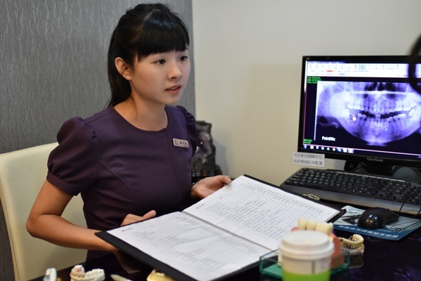 詢問過程中護理師拿著植體(人工牙根)模型為我們母女倆講解品牌差異性