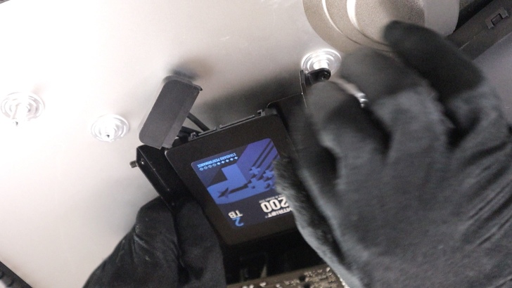 將安裝好固態硬碟的轉接架裝上 iMac 的硬碟安裝空間,安裝時要記得先將 SATA 線拉到轉接架後面,等下才接得上線。